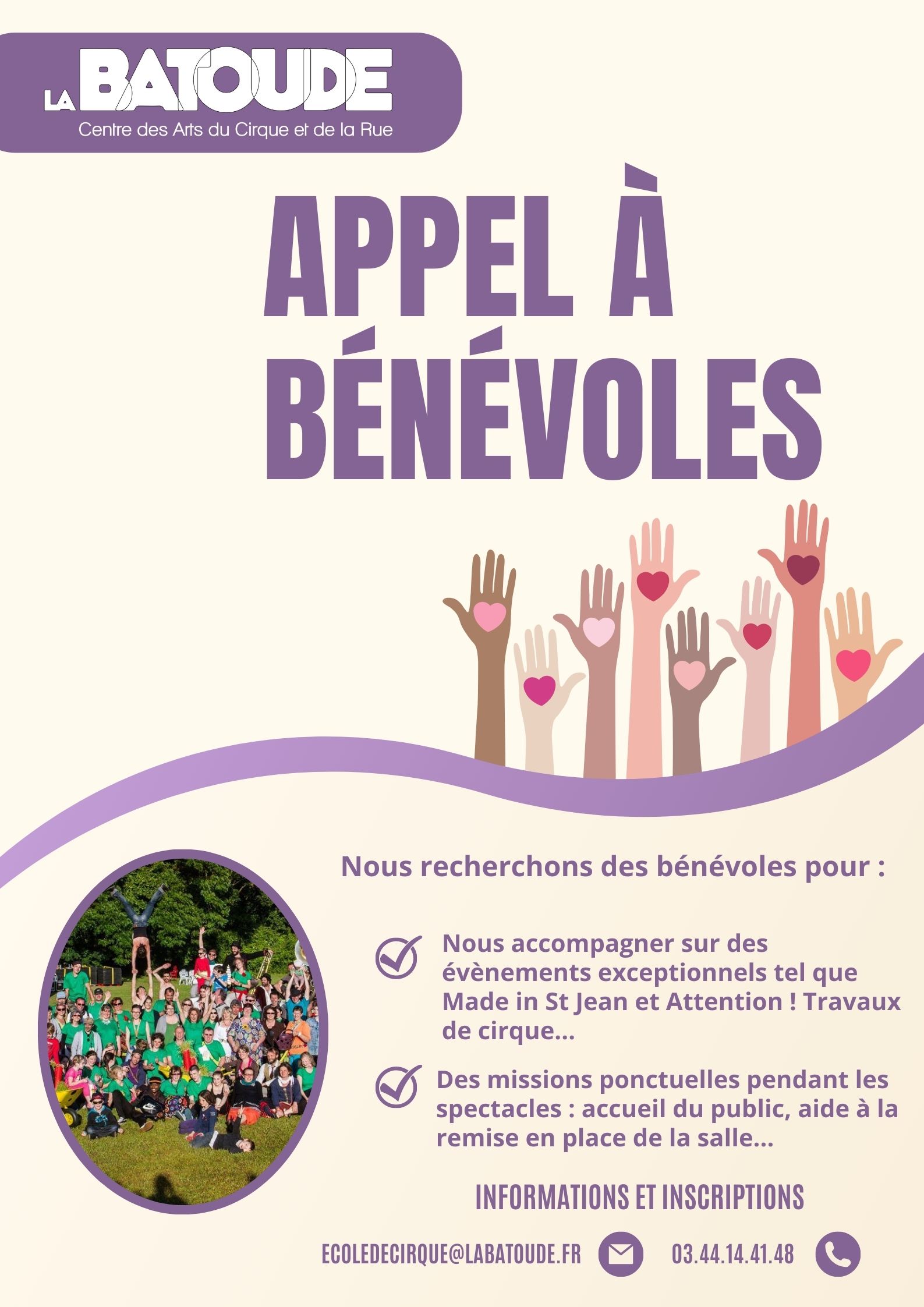 Pour plus d'informations, contactez nous au 03.44.14.41.48 ou par mail à ecoledecirque@labatoude.fr